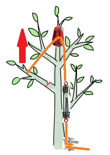 Le câble est passé dans le block-poulie et est attaché au moins au 2/3 de la longueur de la branche. Il faut avoir plus de charges sous le point d’attache qu’au-dessus. Cette fois nous allons utiliser le Portawrap pour barrer la corde. Nous installons notre système d’avantage mécanique sur la section de câble entre la poulie et le Portawrap. Le grimpeur fait une entaille directionnelle en direction du block-poulie puisque nous relevons la branche en cette direction. L’homme au sol peut maintenant commencer le relevage en tirant sur le câble du système d’avantage mécanique. Lorsque la tension est bien mise, le grimpeur peut commencer le trait arrière. La branche se relèvera grâce à la tension déjà dans le câble. Lorsque la branche est bien relevée, le grimpeur peut finir de la couper. L’homme de sol peut défaire le système d,avantage mécanique, débarrer la branche et descendre le tout bien tranquillement.
